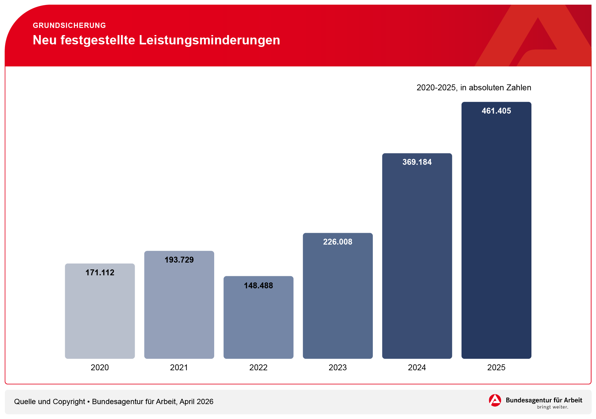 Trotz des Anstiegs blieb der Anteil der Betroffenen vergleichsweise gering: Im Jahresdurchschnitt waren weniger als ein Prozent der erwerbsfähigen Leistungsberechtigten von einer neuen Leistungsminderung betroffen. Die Bundesagentur führt den Anstieg vor allem auf die inzwischen stabileren gesetzlichen Rahmenbedingungen zurück, nachdem die Sanktionsregeln zuvor mehrfach angepasst worden waren.